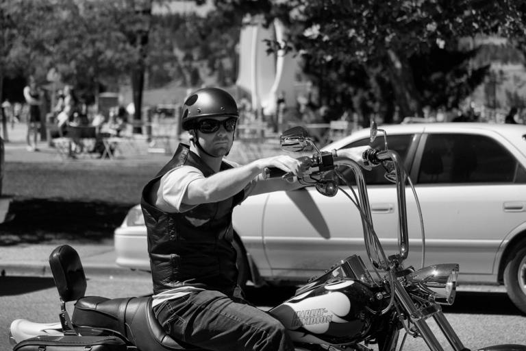 Keywords: blackandwhite black white bw monochrome harleydavidson motorcycle man male person helmet riding driving summer canada britishcolumbia bc okanagan kelowna outdoor downtown street streetphotography