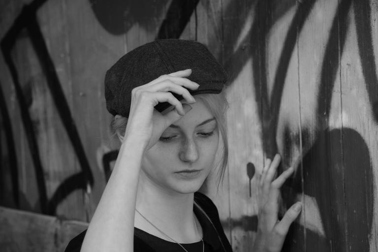 Keywords: young woman pretty shooting female face hair cheeky female model girl pose natural light young woman black and white