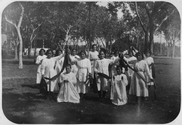 Keywords: Younger school girls enjoying a festival at the Albuquerque Indian School. - NARA - 292876.tif Scope and content This is one of a small collection of photographs of the Albuquerque Indian School which was established in 1881 to provide off-reservation industrial training to the Indians of the Southwest By 1912 the school had 8 primary grades and over 300 students; by 1925 enrollment increased to over 800 students and grades 11 and 12 were added The Albuquerque Indian School contined operating until 1982 when its program was transferred to the Santa Fe Indian School General notes 292876 Local identifier Department of the Interior Bureau of Indian Affairs Albuquerque Indian School 1947 - ca 1964 NARA's Rocky Mountain Region Denver NRGA Building 48 Denver Federal Center West 6th Avenue and Kipling Street Denver CO 80225-0307 other date ~ 1912 Record group Record Group 75 Records of the Bureau of Indian Affairs 1793 - 1999 Record group ARC 404 General Correspondence File of the Albuquerque Indian School compiled 1881 - 1936 Series ARC 292863 File unit File unit ARC Variant control numbers NAIL Control Number NRG-75-AISP-13 yes Other versions NARA-cooperation PD-USGov Albuquerque Indian School |