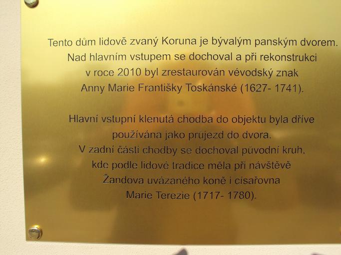 Keywords: Žandov Koruna 2.jpg cs Cedulka na domě zvaném Koruna náměstí Žandov own Zákupák 2010-10-08 50 42 50 221 N 14 23 47 607 E region CZ Žandov Česká Lípa District Information boards in Česká Lípa District
