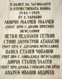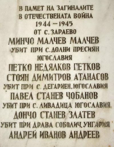 | Keywords: Zaraevo zaginali 1944 1945.jpg bg Село За аево община Попово Паметна плоча с имената на загиналите за аевчани п ез Вто ата световна война own Wlado bg Vladimir Stoykov 2008-10-21 Zaraevo War memorials in Bulgaria Monuments and memorials in Targovishte Province |