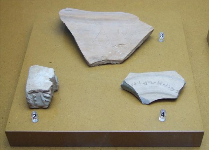 Keywords: Zaragoza - Museo - Grafito 02.jpg 2 Pesa de telar sello ka siglo I adC Lécera Zaragoza // 3 Borde de tinaja grafito kai Botorrita Zaragoza // Grafito sobre tinaja edukenos ausa Cabezo de Cantalobos Albalate del Arzobispo Teruel // Museo de Zaragoza own 07 06 2007 author PD-old Sección de Arqueología del Museo de Zaragoza Contrebia Belaiska Albalate del Arzobispo Lécera 1st century BC Spain Pottery in Aragon Zaragoza Iberian inscriptions Zaragoza Photographs from Zaragoza by ecelan