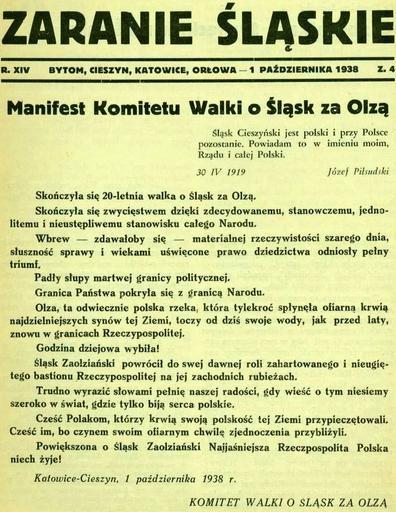 | Keywords: Zaranie Śląskie.jpg en October 1st 1938 issue of Zaranie Śląskie Silesian Dawn containing a manifesto of Komitet Walki o Śląsk za Olzą Committee for Fight for Silesia beyond the Olza River which was an organisation striving to unite Zaolzie with Poland In the manifesto the KWoŚzaO announced the victorious end of the 20 year fight for incorporation of Zaolzie into Poland Zaranie Śląskie of October 1st 1938 Zaranie Śląskie 1938-10-01 PD-Art Czechoslovak-Polish dispute over Cieszyn Silesia Propaganda of Poland Anti-Czech propaganda |