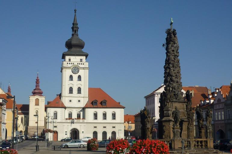 Keywords: zatec czech republic town sky clouds scenic skyline vehicles monument decorated street urban village outside church