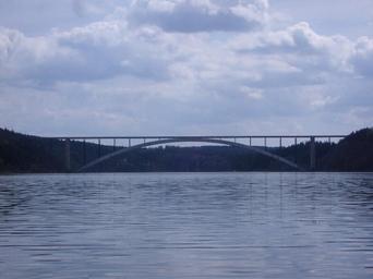 Keywords: Žďákovský most.jpg en Žďákov Bridge at Orlík Dam own Barsov 2005-04 Žďákovský most Orlík Reservoir
