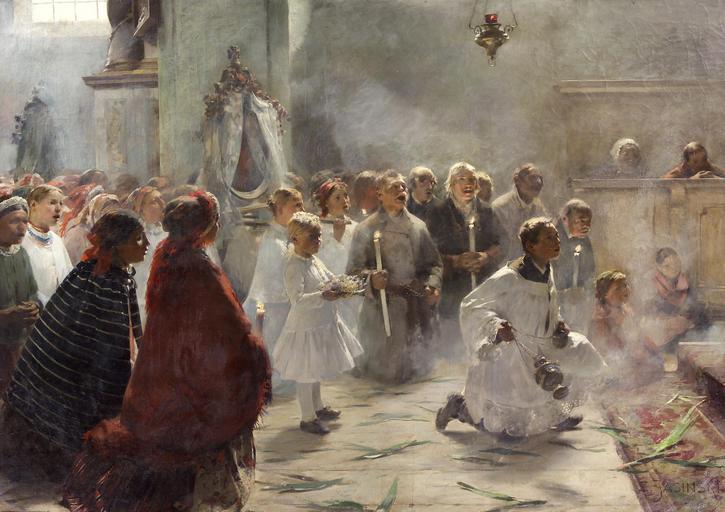 | Keywords: Zdzisław Jasiński Palm Sunday 1891.jpg Zdzisław Jasiński Zdzisław Jasiński 1863-1932 Zdzisław Jasiński Zdzisław Jasiński 1863-1932 pl 1891 oil canvas cm 208 3 290 8 object history credit line Z Jasinski Monachium 1891 ~ lr signature / place / date accession number 1 http //www artnet com/artists/lotdetailpage aspx lot_id C14A6FEF0C3EB86C1C7E43288FC15FB6 ArtNet<br/>2 http //www bonhams com/auctions/15252/lot/113/ Bonhams San Francisco 16 05 2007 lot 113 PD-old-auto-1923 1932 DEFAULTSORT Jasinski Zdzislaw; Palm Sunday 1891; Bonhams 2007 Zdzisław Jasiński Altar servers in art Churchgoing in art 1891 paintings 19th-century genre paintings Images from Bonhams |
