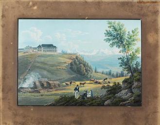 Keywords: Zentralbibliothek Solothurn - Auf dem Weissenstein - aa0137.tif Artwork Johann Jakob Meyer Information field Engraver R Bodmer Blick von NNW auf das Kurhaus auf dem Weissenstein mit Nebengebäuden Im Vordergrund Küherstaffage Kurgäste Köhler im Hintergrund das Mittelland und die Alpenkette between 1820 1840 Technique Aquatint paper colored Size mm 206 143 institution Zentralbibliothek Solothurn object history credit line accession number Call number aa0137 Zentralbibliothek Solothurn Public domain Information field ZBS form heading Vedute Information field ZBS form heading Panorama Zentralbibliothek Solothurn PD-old-70-1923 Historical images of Weissenstein |