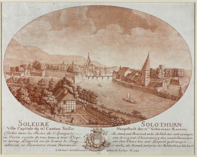 Keywords: Zentralbibliothek Solothurn - SOLEURE Ville Capitale du 11e Canton Suisse Célèbre dans les Fastes de lAntiquité sa Vertu resista de tous tems a tout Piege et même Léopold en en levant le siege admira sa Bravoure et - aa0006.tif Blick von W Aarhof auf die Stadt Solothurn im Vordergrund im Garten arbeitende Leute auf dem Fluss Segelschiffe mit Lasten 1790 Technique Aquatint paper brown Size mm 323 248 institution Zentralbibliothek Solothurn object history credit line accession number Call number aa0006 Zentralbibliothek Solothurn Public domain Information field ZBS form heading Vedute Zentralbibliothek Solothurn PD-old-100-1923 Historical images of Solothurn Laurent Louis Midart |