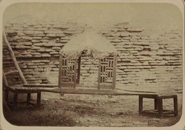 Keywords: Zeravshan Okrug. Palanquins of Saint Musa Khan Preserved in the Mosque of Saint Makhdum Azam in the Village of Dakhbit WDL3897.png Artwork ru Богаевский иколай Владими ович 1843 1912 гг fr Bogaevskii Nikolaï V 1843-1912 en Bogaevskii Nikolai V 1843-1912 zh 亚历山大·L· ,1840-1888 年 pt Bogaevskii Nikolai V 1843-1912 ar بوغافسكي، نيكولاي ف ، 1843-1912 es Bogaevskii Nikolai V 1843-1912 ru Зе авшанский ок уг Паланкин святого усы-хана х анящийся в мечети святого ахдуми Азама в кишлаке Дагбит fr Okrug de Zeravchan Palanquins du vénérable Musa Khan conservés dans la mosquée du vénérable Makhdoum Azam dans le village de Dakhbit en Zeravshan Okrug Palanquins of Saint Musa Khan Preserved in the Mosque of Saint Makhdum Azam in the Village of Dakhbit zh 扎拉夫桑区 达克比特 麦赫 姆·阿扎姆清 寺中 存的 穆萨·汗的轿子 pt Okrug de Zeravshan Palanquim do santo Musa Khan preservado na mesquita de santo Mahdum Azam no povoado de Dakhbit ar زيرافشان أوكروج مِحَفَّة الوَلِيّ موسى خان المحفوظة بمسجد الوَلِيّ مخدوم عزَّام في بلدة دَخبيت ru Эта фотог афия паланкина носилок из мечети ахдуми Азама в кишлаке Дагбит Узбекистан соде жится в а хеологической части <em> Ту кестанского альбома </em> Шеститомное фотог афическое исследование было подготовлено и издано в 1871 1872 гг под пат онажем гене ала Константина П фон Кауфмана пе вого гене ал-губе нато а 1867 1882 гг Ту кестана как называли в то в емя те ито ию Цент альной Азии п инадлежавшую Российской импе ии Кишлак Дагбит находился на те ито ии Зе авшанского <em>ок уга</em> об азованного в составе Российской импе ии в 1868 г после того как оссийские войска заняли восточную часть Буха ского ханства сов еменный Узбекистан К концу 1868 г к ок угу была п исоединена те ито ия вок уг го ода Пенджикента Панджакента ныне находящегося на севе о-западе Таджикистана К 1871 г в ок уг были включены феодальные владения в ве ховьях еки Зе авшан п итока Амуда ьи С еди го одов асположенных на еке Зе авшан наиболее заметный след в исто ии оставил Сама канд Дагбит считается таджикским топонимом и относится к местности населенной узбеками и таджиками П едставленный на фотог афии паланкин п инадлежал почитаемому елигиозному лиде у усе-хану Паланкин п едставляет собой бесколесное с едство пе едвижения пе емещаемое людьми и в данном случае состоит из к ытой кабины с сиденьем и длинных шестов кото ые подде живались носильщиками <br>Д евности; Фотог афические исследования; Паланкины fr Cette photographie du palanquin chaise à porteurs dans la mosquée Makhdoum Azam située dans le village de Dakhbit Ouzbékistan est extraite de l ouvrage archéologique <em>Album du Turkestan</em> Cet inventaire photographique en six volumes fut réalisé entre 1871 et 1872 sous le patronage du général Konstantin P von Kaufman premier gouverneur général 1867-1882 du Turkestan nom donné aux territoires d'Asie centrale de l'Empire russe Le village de Dakhbit était situé dans le district <em>okrug</em> de Zeravchan qui devint partie intégrante de l Empire russe en 1868 lorsque les troupes russes occupèrent la partie orientale du khanat de Boukhara actuel Ouzbékistan Fin 1868 la zone autour de la ville de Pendjikent actuel Panjakent dans le nord du Tadjikistan a été annexée au district Dès 1871 le district avait absorbé des fiefs dans le cours supérieur du fleuve Zeravchan un affluent de l Amou-Daria Samarcande est la plus importante des villes historiques du Zeravchan « Dakhbit » est considéré comme un toponyme tadjik dans une région habitée par des populations ouzbek et tadjik Le palanquin montré ici appartint au chef religieux vénéré Musa Khan Il s agissait d un mode de déplacement sans roues à propulsion humaine constitué ici d une cabine fermée et de longues perches soulevées par des porteurs <br>Antiquités; Inventaires photographiques; Chaises à porteurs en This photograph of a palanquin sedan chair from the Makhdum Azam mosque in the village of Dakhbit Uzbekistan is from the archeological part of <em>Turkestan Album</em> The six-volume photographic survey was produced in 1871 72 under the patronage of General Konstantin P von Kaufman the first governor-general 1867 82 of Turkestan as the Russian Empire s Central Asian territories were called The village of Dakhbit was located in Zeravshan District <em>okrug</em> formed as part of the Russian Empire in 1868 when Russian troops occupied the eastern part of the Khanate of Bukhara in present-day Uzbekistan By the end of 1868 the area around the town of Pendzhikent Panjakent now in northwest Tajikistan was added to the district By 1871 the district absorbed fiefdoms in the uppe