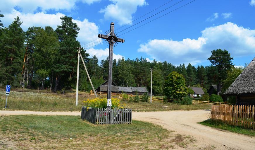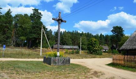 Keywords: Zervynos, kryžius.JPG Medinis dzūkiškas kryžius Zervynos Dzūkijos NP Varėnos raj own work 2013-08-17 Šarūnas Šimkus Zervynos Wooden crosses in Lithuania Kryžiai su koplytelės tipo apvadu ar stogu centre