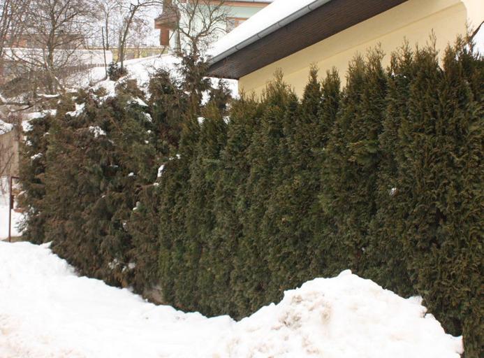 | Keywords: Zima 2010 01 22 1087.jpg en Thuja occidentalis hedge Czech republic EU Brno Komín cs Thuja occidentalis živý plot z túje dva různé kultivary zima Brno Komín Chaloupky own I Sáček senior 2010-01-22 Thuja occidentalis cultivated Plants in Brno-Komín |