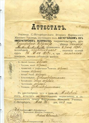| Keywords: Zinaida-Makova-attestat.jpg  ru Аттестат об окончании полного ку са Санкт-Пете бу гского Вто ого  а иинского женского училища выдан Зинаиде Ивановне  аковой 1912-05-26 Own family archive Not applicable PD-RusEmpire Uploaded with UploadWizard Nikolai Ivanovich Makov Educational documents of the Russian Empire |