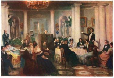 Keywords: Zinaida Volkonskaya's salon.jpeg Г Г ясоедов В салоне Зинаиды Волконской В емя создания 1899 1905 1905 1907 1908 ате иалы и техника Холст масло Разме 177 3×268 5 Ва ианты названия Пушкин и его д узья слушают декламацию ицкевича в салоне княгини З А Волконской; ицкевич на вече е у княгини Волконской; ицкевич в салоне Зинаиды Волконской; Пушкин в салоне З А Волконской слушает имп овизацию А ицкевича; ицкевич читает свои п оизведения в салоне Зинаиды Волконской; осква декаб ь 1826 года ицкевич в салоне княгини Зинаиды Волконской имп овизи ует с еди усских писателей Каталог 36-й пе едвижной выставки ; В салоне Зинаиды Волконской; Салон Зинаиды Волконской Из коллекции В И и Г Солдатёнковых Сов еменное место х анения Все оссийский музей А С Пушкина Инвента ный номе КП-14694 Сп ава князь П А Вяземский Е А Ба атынский А С Хомяков З А Волконская И И Козлов В А Жуковский А С Пушкин П Погодин Д В Веневитинов П Я Чаадаев и д угие Помимо этой ка тины ясоедов об ащался к лите ату ной теме в ка тине «Чтение К ейце овой сонаты Л Толстого овые истины » 1893 Цитаты Ста ик снова ожил п иехал в Пете бу г и затеял большую ка тину «Пушкин на вече е у ицкевича» Какую тему мог взять ясоедов в пе еживаемое тепе ь им в емя а одничество заме ло под давлением надвинувшейся еакции и новых общественных условий подпольная абота еволюционе ов не была заметна для художников так как не от ажалась в лите ату е кото ой главным об азом питались художники Для всего была ст огая цензу а Ок ужающая действительность с мелкобу жуазными инте есами не давала пищи для большого тво чества Большинство художников уда илось в эстетизм в любование фо мой масте ством и в декадентство отпадая от жизни действительности Внимание многих п ивлекала ста ина эпохи таившие в себе много внешне к асивого Одних пленил Ве саль или его стиль пе енесённый в Россию д угих ампи дво янские гнезда и п очее ясоедов об атившись к ста ине искал и в ней «духовного идейного» Желая в ка тине п едставить эпоху он б ал не пустое светское общество а людей мысли двух великих поэтов и в подобающей им обстановке П и единении мысли поэзии двух ми овых величин и всё к угом должно быть умно к асиво Так п едставляется мне задача ясоедова с кото ой он сп авиться не только в то в емя но и аньше не смог бы Для этого самому нужно было стоять на у овне великих поэтов с их ог омным азмахом тво чества чего у ясоедова не было Он искал к асоту но впадал только в слащавую к асивость и оза ить вдохновением лица поэтов выделить их из ок ужающей с еды был не в силах Ка тина явилась лишь потугой на нечто се ьёзное и никакого впечатления на общество не п оизвела 1 Салон Волконской за годы её п ебывания в оскве становится «цент альным лите ату но-а тистическим салоном» столицы «изящным сбо ным местом всех замечательных и отбо ных личностей сов еменного общества» Здесь «соединялись п едставители большого света сановники и к асавицы молодёжь и воз аст з елый люди умственного т уда п офессо а писатели жу налисты поэты художники» всё «носило отпечаток служения искусству и мысли» бывали «чтения конце ты дилетантами и любительницами п едставления итальянских опе » и «пос еди а тистов» «во главе их стояла сама хозяйка дома» Количество имён-«знаков обозначающих художественную элиту» столь велико что культу ные ме оп иятия салона Волконской впоследствии мифологизи уются в сознании и 