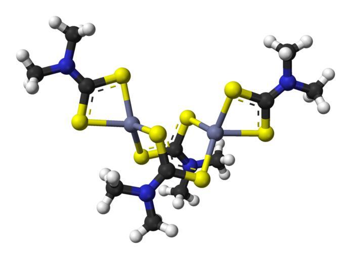 Keywords: Zinc-dimethyldithiocarbamate-from-xtal-3D-balls.png Ball-and-stick model of the zinc dimethyldithiocarbamate dimer as found in the crystal structure Monomer formula C<sub>6</sub>H<sub>12</sub>N<sub>2</sub>S<sub>4</sub>Zn Dimer formula C<sub>12</sub>H<sub>24</sub>N<sub>4</sub>S<sub>8</sub>Zn<sub>2</sub> X-ray crystallographic data from http //dx doi org/10 1107/S0365110X66003426 Acta Cryst 1966 21 536-546 Model constructed in http //www crystalmaker com/ CrystalMaker 8 1 Image generated in http //accelrys com/products/discovery-studio/visualization/discovery-studio-visualizer html Accelrys DS Visualizer Own 2009-03-15 Ben Mills Benjah-bmm27 Images by Ben Mills Zinc dimethyldithiocarbamate Dimers |