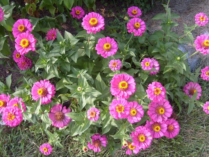 Keywords: zinnia flowers pink plants green leaves stems colorful blossoms blooms blooming flowering ornamental floral garden spring