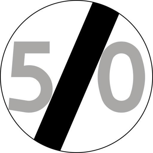 | Keywords: Znak B-34.svg Znak B-34 koniec ograniczenia prędkości tu 50 km/h own <br> Inkscape 2007-12-31 Szczepan <small>dyskusja Mail</small> 18 29 31 December 2006 UTC Szczepan1990 Diagrams of prohibitory road signs of Poland SVG road signs in Poland Speed limit road signs 50 number Diagrams of grey road signs |
