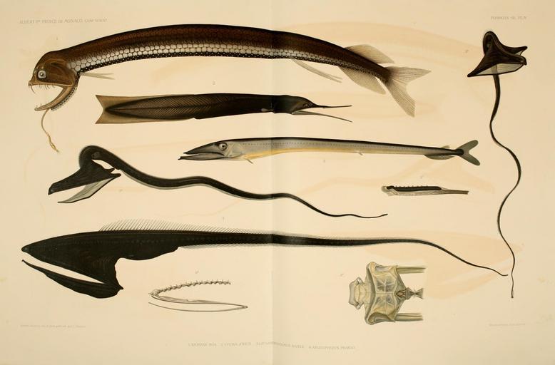 Keywords: Zugmayer1912 Planche IV.JPG Eurypharynx pelecanoides Fig 1 Stomias boa Stomias boa boa <small> Risso 1810 </small><br/> Fig 2 Cyeama atrum Cyema atrum <small>Günther 1878</small><br/> Fig 3 Gastrostomus bairdi Eurypharynx pelecanoides <small>Vaillant 1882</small> adult <br/> Fig 3<sup>a</sup> Gastrostomus bairdi Eurypharynx pelecanoides <small>Vaillant 1882</small> juvenile <br/> Fig 3<sup>b</sup> Gastrostomus bairdi Eurypharynx pelecanoides <small>Vaillant 1882</small> juvenile in vertical position <br/> Fig 3<sup>c</sup> Gastrostomus bairdi Eurypharynx pelecanoides <small>Vaillant 1882</small> caudal organ <br/> Fig 3<sup>d</sup> and 3<sup>e</sup> Gastrostomus bairdi Eurypharynx pelecanoides <small>Vaillant 1882</small> cranium <br/> Fig 4 Anotopterus pharao Anotopterus pharao <small>Zugmayer 1911</small> Résultats des campagnes scientifiques accomplies sur son yacht par Albert Ier prince souverain de Monaco 1911 http //www archive org/stream/rsultatsdescam35albe page/n195/mode/2up Emma Kissling 1912 public domain due to age File Anotopterus pharao par Zugmayer jpg File Cyema atrum par Zugmayer jpg File Stomias boa par Zugmayer jpg PD-old Teleostei Stomias boa Cyema atrum Eurypharynx pelecanoides Anotopterus pharao |