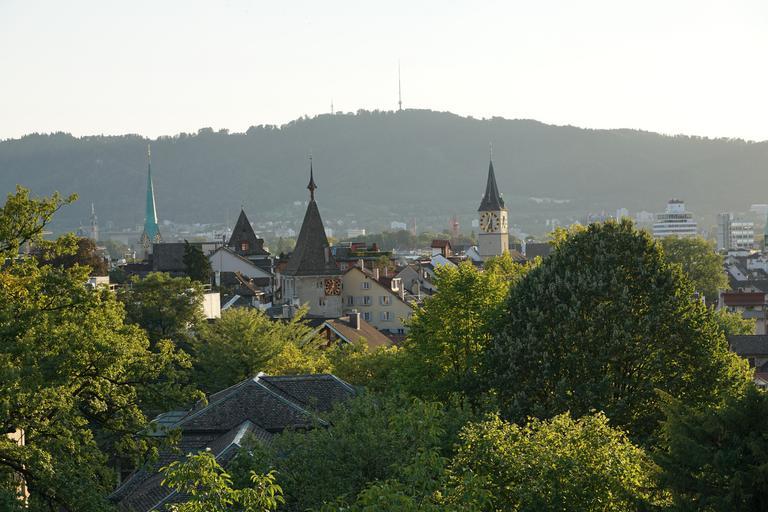 Keywords: zurich old town churches switzerland roofs city homes mountains green historically uni tree summer evening towers