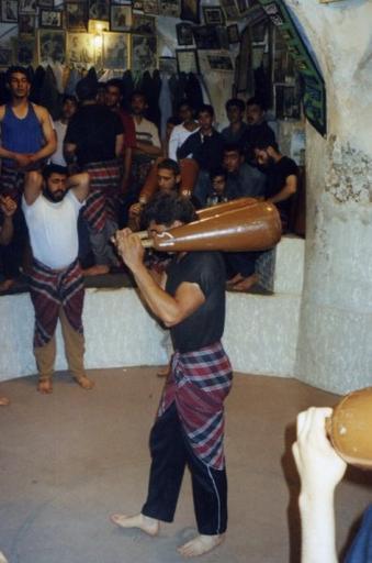 Keywords: Zurkhuneh quilles.JPEG Exercice d'assouplissement aux quilles de bois 2006-09-06 own assumed Pentocelo~commonswiki Zurkhaneh Meels