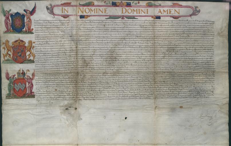Keywords: Zygmunt III nadaje Kolegium Jezuickiemu w Poznaniu uprawnienia Akademii.jpg accession number 53/1474/D6 place of creation Warszawa Pergamin ozdobiony trzema herbami i wstęgą z intytulacją Pod zakładką podpis Sigismundus Rex Stanislaus Lubieński sekretarz koronny cc-zero Kolegium Jezuickie w Poznaniu Historical documents of Poznań Sigismund III of Poland State Archive in Poznań Uploaded with VicuñaUploader |