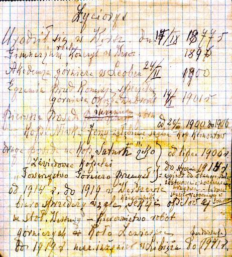 Keywords: Zygmunt Szczotkowski-zyciorys.jpg pl Brudnopis życiorysu Zygmunta Szczotkowskiego sporzÄ…dzony rÄ™kÄ… wdowy po nim Marii own Julo ca 1944 PD-heirs float 1 width 50 style background-color inherit;border-collapse collapse;border-style none;margin 5em 75em; 20 valign top style color B2B7F2;font-size 40px;font-family 'Times New Roman' serif;font-weight bold;text-align left;padding 2 2px;padding-top 4px top align left style padding 0 10px; <big>Å»yciorys</big> UrodziÅ‚ siÄ™ w Warsz dn 17/IX 1877 r Gimnazjum realne koÅ„czyÅ‚ w Warsz 1896 AkademjÄ™ górniczÄ… w Leoben 24/II 1900 Egzamin przed KomisjÄ… specjalnÄ… górniczÄ… okrÄ™gu DÄ…browsk 19/I 1901 r Pierwsza posada inżyniera górn od 20/III 1900 do 1906 Kop Niwka “Jerzy zgłębianie szybu Kop Klimontów druga posada na Kop žSaturn jako od lipca 1906 r zawiadowca kopalni do stycznia 1914 r žTowarzystwa Górniczo przemysÅ‚ z wyjazdem do Francji Belgii zastosowanie nowoczesnych urzÄ…dzeÅ„ “ budowa stacji ratowniczej w Sosnowcu od 1914 r do 1919 w Warszawie biuro sprzedaży wÄ™gla “ kierownik sekcji opaÅ‚owej m StoÅ‚ Warszawy “ kierownictwo robót górniczych koÅ‚o Zawiercia od 1919 r <ref name błąd /> nacz inżynier w Libiążu do października 1941 r <ref name błąd >tu błędy merytoryczne; w rzeczywistoÅ›ci w Libiążu pracowaÅ‚ od 1 III 1920 do wrzeÅ›nia 1940</ref> 20 valign bottom style color B2B7F2;font-size 40px;font-family 'Times New Roman' serif;font-weight bold;text-align right;padding 2 2px;padding 4px; - 3 style padding-top 10px OryginaÅ‚ napisany ołówkiem na kartce z notatnika ---- <references /> Zygmunt Szczotkowski
